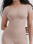 Het Selina Naadloos Shaping T-Shirt met korte mouwen verenigt maximaal comfort met een subtiele figuurcorrigerende werking. Dankzij de naadloze afwerking ligt het elastische materiaal prettig op de huid en zorgt het voor een gladde, flatterende pasvorm. De subtiele compressie benadrukt de taille, terwijl de ademende stof een aangenaam draaggevoel de hele dag door garandeert. Of als shapewear onder strakke kleding of als stijlvolle basic – dit T-shirt past perfect bij jouw look.