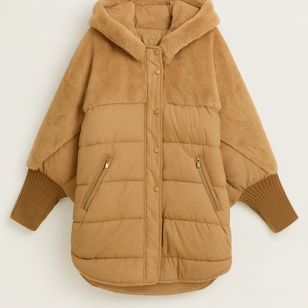 Denna vinterkappa för kvinnor kombinerar modern elegans med maximal komfort. Den stora huvan, kantad med pälsdetaljer, och de elastiska, förlängda manschetterna som når armbågarna skapar en trendig look och behaglig värme. Kappans design accentueras av pälsdetaljer på sidorna och bröstet, vilket skapar en lyxig, modern look.